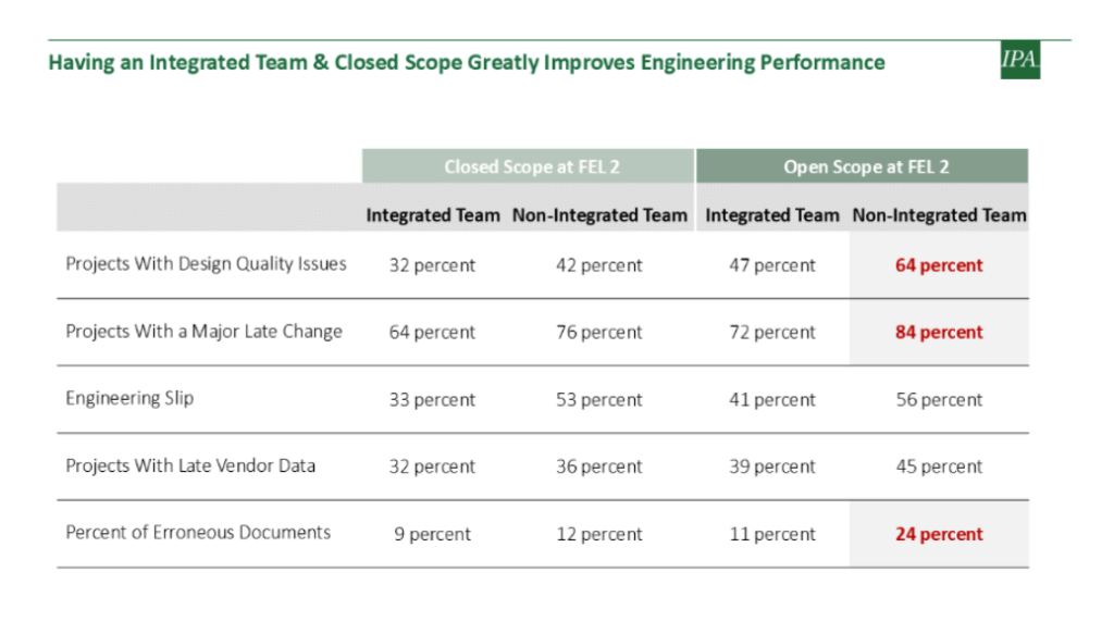 In a recent article published by IPA Global, “Why Engineering Performance Isn’t Improving and What to Do About It,” author Michael Mace highlights several persistent challenges undermining project outcomes. Obstacles range from design quality issues and late-stage changes to engineering delays and flawed assumptions made while awaiting vendor data. Mace argues that one of the most effective ways to enhance engineering quality is through the use of a fully integrated team. His research shows that, regardless of scope definition at FEL2, projects with integrated teams achieved measurable improvements in engineering quality—ranging from 3% to as much as 22%.